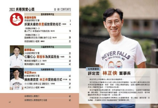 30年來,林正俠董事長全力投入唐氏症患者照護事業。為全國3萬多名唐氏症患者及其家庭爭取醫療、教育、就業、安置之機會與福祉,並戮力翻轉社會對唐氏症者及身心障礙者的偏見,打造更融合的社會。林正俠董事長並開全國先例,將早療專業引進公共托育中心,並創辦多項服務組織,廣設據點,其服務擴及離島及偏鄉。