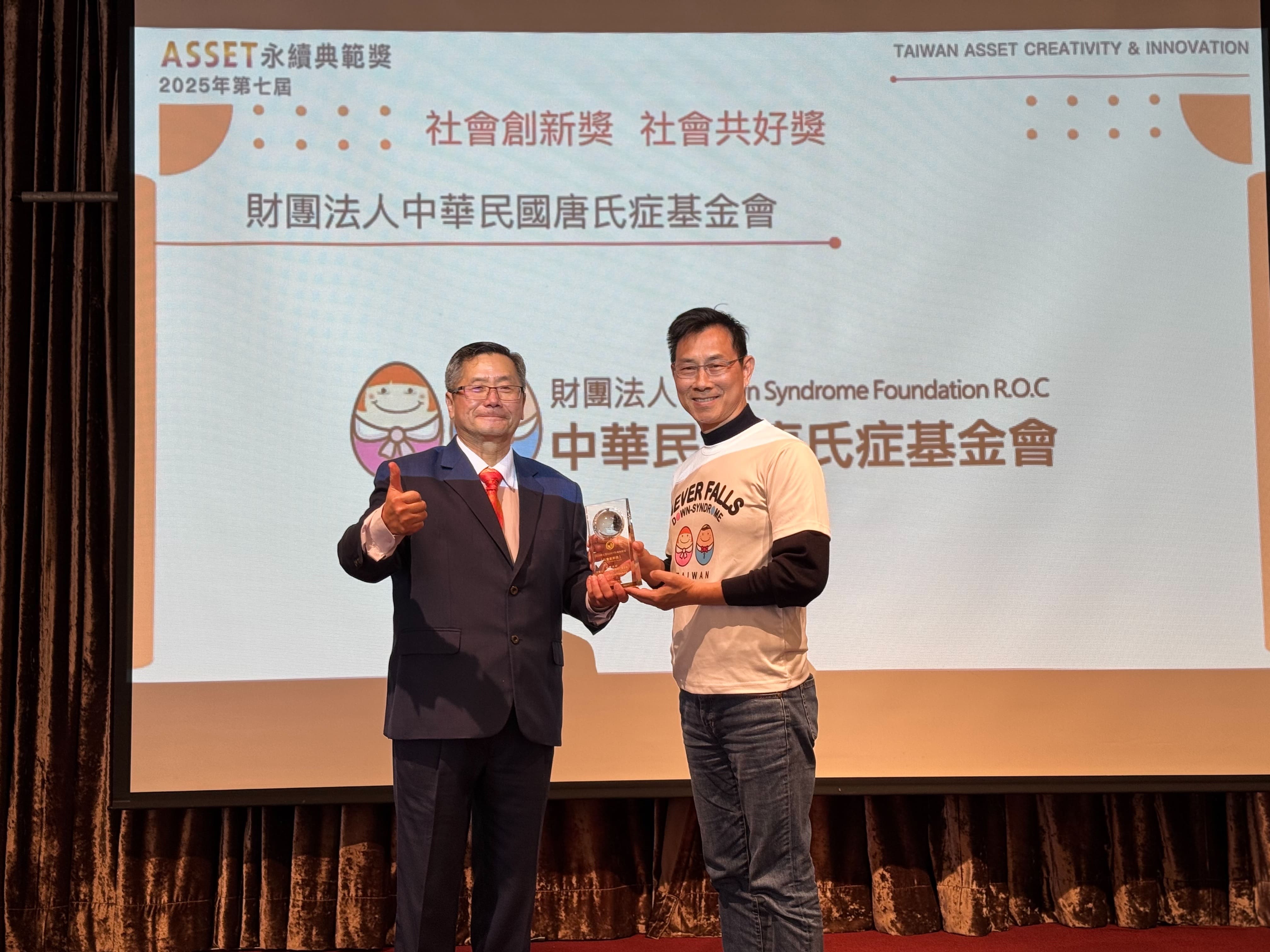唐氏症基金會由於永續發展策略及實踐推展能量備受評審團肯定,足為各界師法學習,因此決定將社會金質獎(S)授予本會。