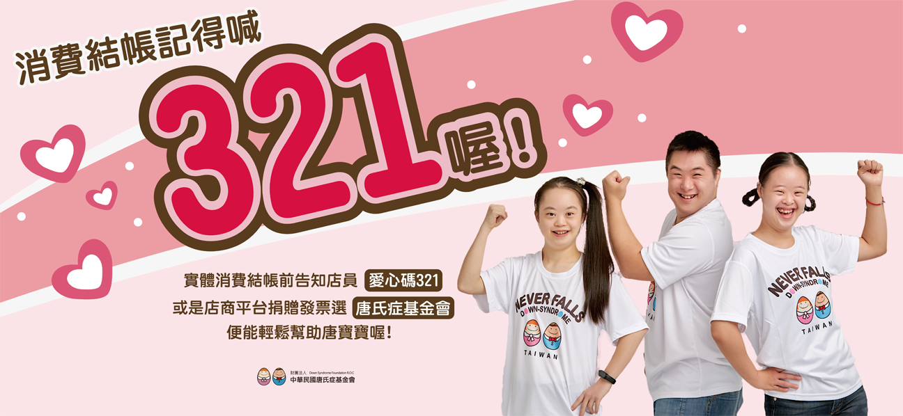 在操作結帳頁面時,點選捐贈電子發票,並輸入愛心碼【321】或搜尋【唐氏症基金會】即可完成。