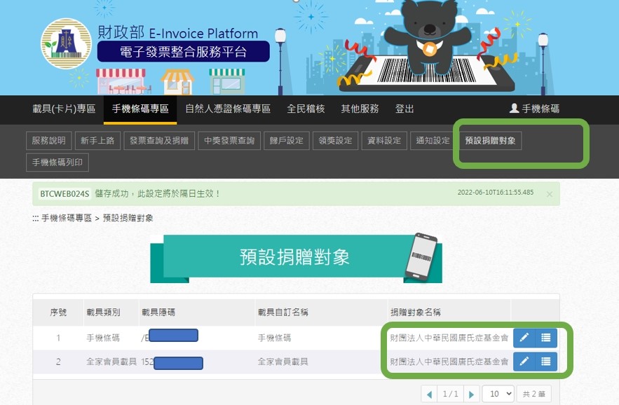 - 手機下載統一發票APP,並於電子載具頁面設定愛心碼「321」