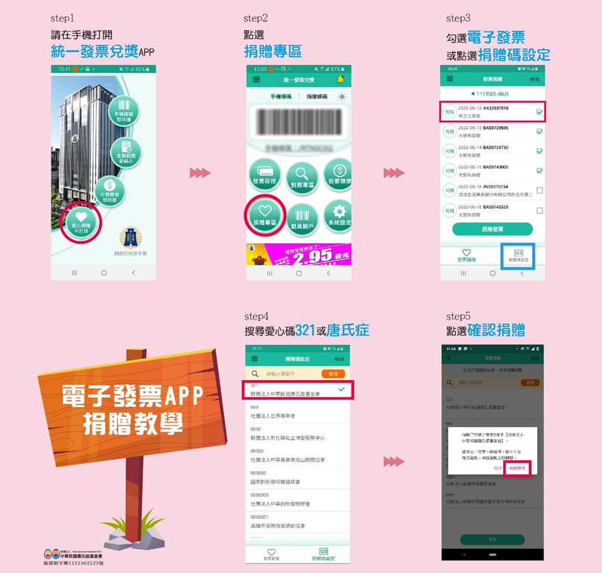 - I-cash或悠遊卡等電子發票載具存入發票48小時後,可至財政部電子發票平台、7-ELEVEN ibon、全家FamiPort、萊爾富Life-ET等,並以自然人憑證登入,勾選要捐贈的發票,設定選擇捐贈【唐氏症基金會】,即可捐贈完成。