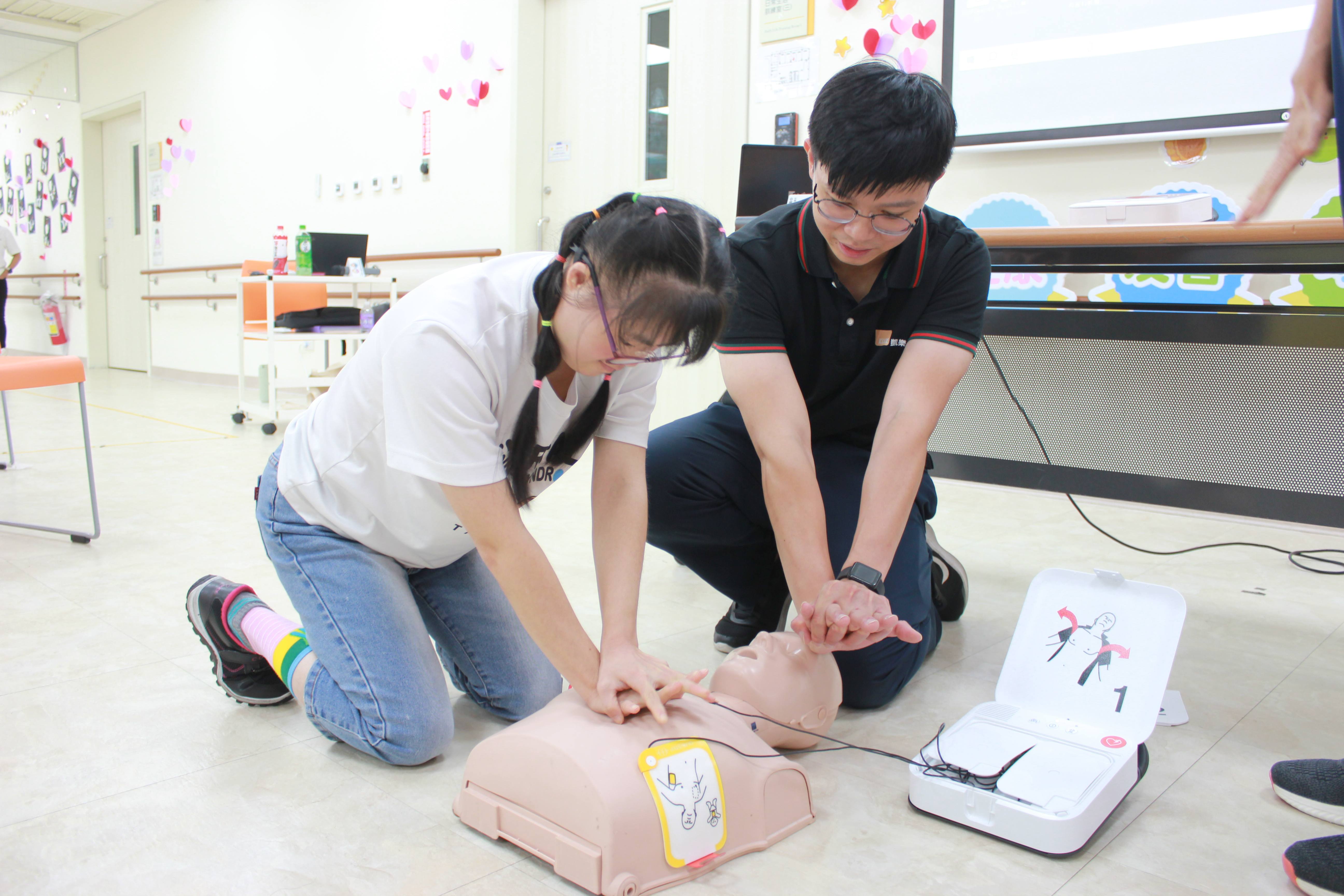活動除了捐贈儀式外,還在永福之家興岩園區舉辦AED教學訓練。該園區有77名服務對象,其中90%為重度以上的身心障礙者,需高度協助。教學訓練特別邀請唐寶寶家長與老師參與AED操作,進一步提升應急處理能力。現場家長分享了心臟併發症對家庭帶來的挑戰,並強調早療就醫的重要性及操作AED的心得。這不僅讓人對唐寶寶面臨的心臟問題有了更深的了解,也讓大家認識到及時急救的必要性。