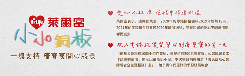 唐氏症基金會與萊爾富今年再度攜手,自4月13日至7月12日止推出「小小銅板 自立希望」零錢捐勸募活動。邀請演員郭書瑤與唐寶寶們拍攝公益短片,呼籲消費者於活動期間前往全台萊爾富便利商店,投入零錢,讓愛心增溫,支持唐氏症及心智障礙者全生涯服務計畫。郭書瑤提到,唐寶寶的成長過程中得面對許多考驗,尤其在拍攝現場親身感受寶寶們認真努力的表現,會被他們堅強跟天真的模樣深深感動,也可以感受到他們對事情的專注,堅持做到完美。郭書瑤呼籲粉絲及社會大眾一起於活動期間踴躍到萊爾富支持零錢捐,為唐寶寶及心智障礙的孩子們籌備工作學習與才藝訓練的經費,讓他們順利進入職場,繼續前進!