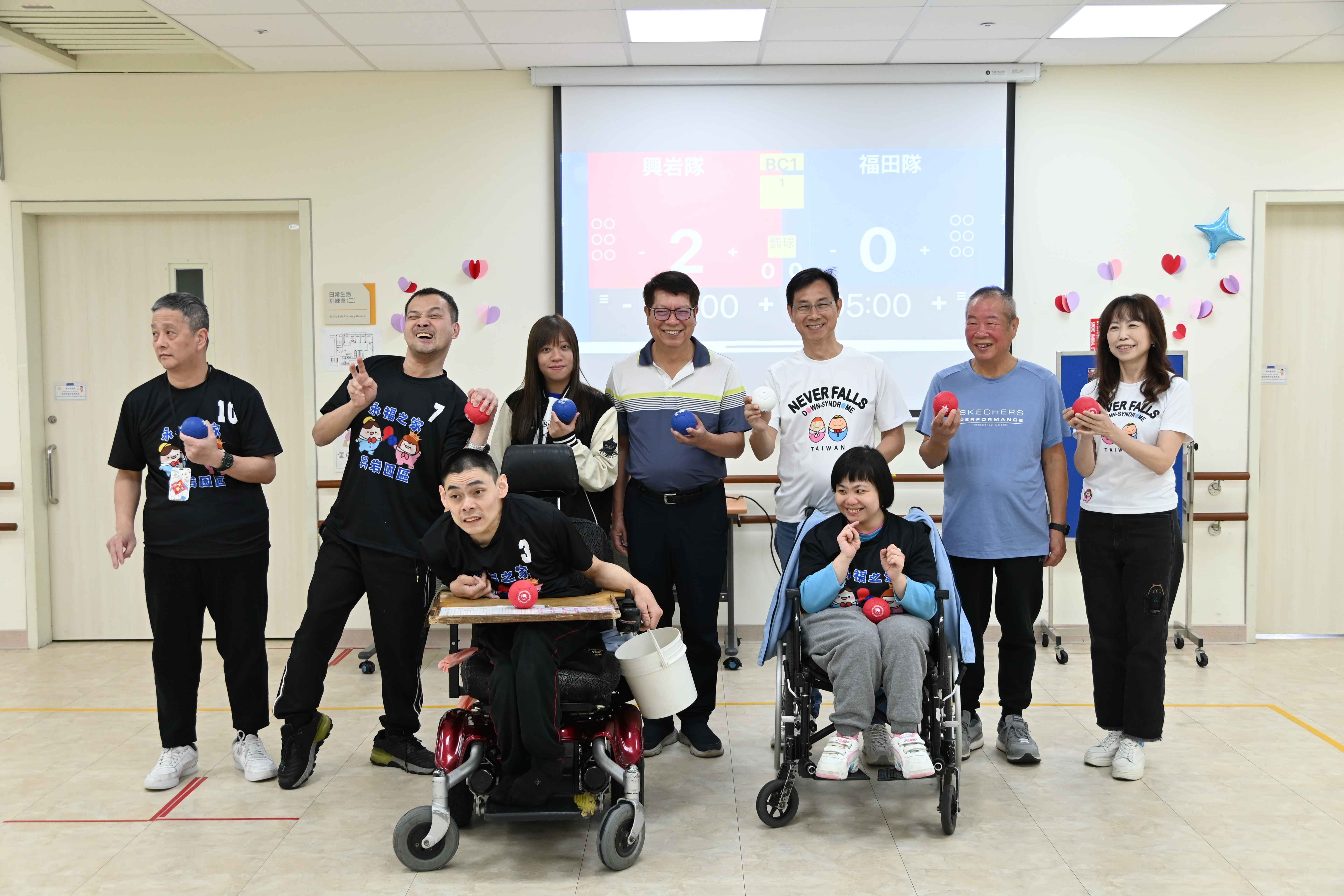 捐贈儀式後,李福田董事長也與興岩園區的院生一起進行地板滾球運動,拉近彼此的距離。地板滾球是結合肢體、智力、情緒、群體適應、娛樂及比賽競技的運動,使用極少的肢體動作,但需要運用策略和技巧,特別針對重度動作控制困難的身心障礙者所設計,具有多重復健及促進生理、心理健康的功能,經歷地板滾球體驗與互動,李福田董事長也更體認到陪伴身心障礙院生的不容易。