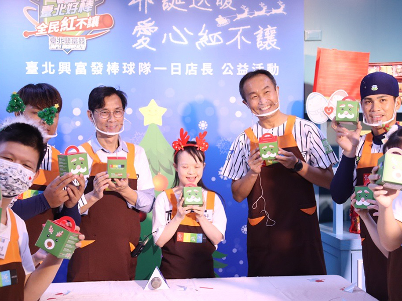 臺北興富發棒球隊長期關注社會公益議題!臺北市政府體育局李再立 局長帶領球員們今(16)日下午於唐氏症基金會愛不囉嗦承德店舉行「耶誕送暖,愛心紅不讓」一日店長公益活動,一起在耶誕前夕放下球棒,拿起擀麵棍與唐寶寶學習製作餅乾、包裝禮盒, 並帶領他們體驗樂樂棒球,親身力挺唐寶寶的耶誕禮盒。