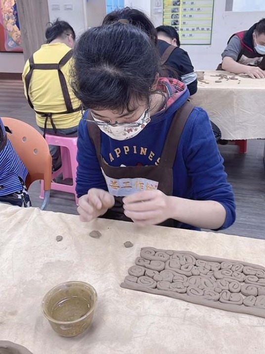 歡喜工作坊的唐氏症與心智障礙學員平日除了透過手工皂學習一技之長,老師也為他們安排多元的課程,包括木刻、壓克力畫、陶藝…等,在陶藝課程中學員嘗試由平面轉為立體形式的創作,透過創作過程與陶土的互動練習力氣的拿捏、訓練手部肌肉、培養創造力,每堂課老師會先示範,讓學員參考和思考想為自己作品呈現的模樣,透過自己的雙手拍土、挖洞、手捏成形,形塑出獨一無二的作品,再由老師為學員微調,創作出兼具藝術與實用性的盤子、花器、筆筒…有時候在窯燒的過程裡作品會裂開、毀損,學員們也要學著接受不如預期和不夠完美,甚至失敗的結果。