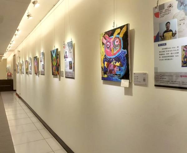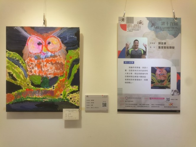 而藍羽紅臉的貓頭鷹則是中度智障邱禹農的作品,他酷愛kitty貓,於是將對kitty貓的熱情透過貓頭鷹畫作傳達,用色也多所相似。20名唐寶寶的作品受邀展覽,唐氏症關愛協會帶著5名代表參加開幕,孩子們看到自己的畫作掛在牆上展出,還得到讚美,心情顯得興奮、快樂
