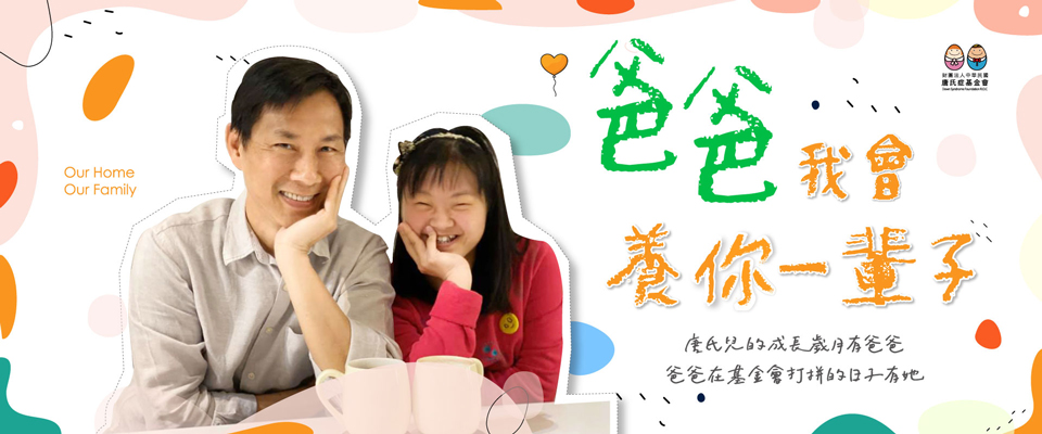 小時候,在那個資訊還不發達的年代,爸爸除了要忍受還沒接受治療與專業訓練而常常發脾氣耍任性的我,在外面還要承接各種的流言蜚語,哪怕有很多人對他說了不禮貌的話,就算心中受傷也不曾放棄。爸爸總是認真的講解唐氏症的原由,讓大家明白我們跟別人沒有什麼不一樣,只是需要多一點點的支持而已。現在的我已經長大了,我今年27歲,爸爸是我最好的靠山,我也是爸爸最好的依靠,我們約定好要四處遊玩、平安健康、一起變老…,我也許下心中的願望:「爸爸~我會養你一輩子」。