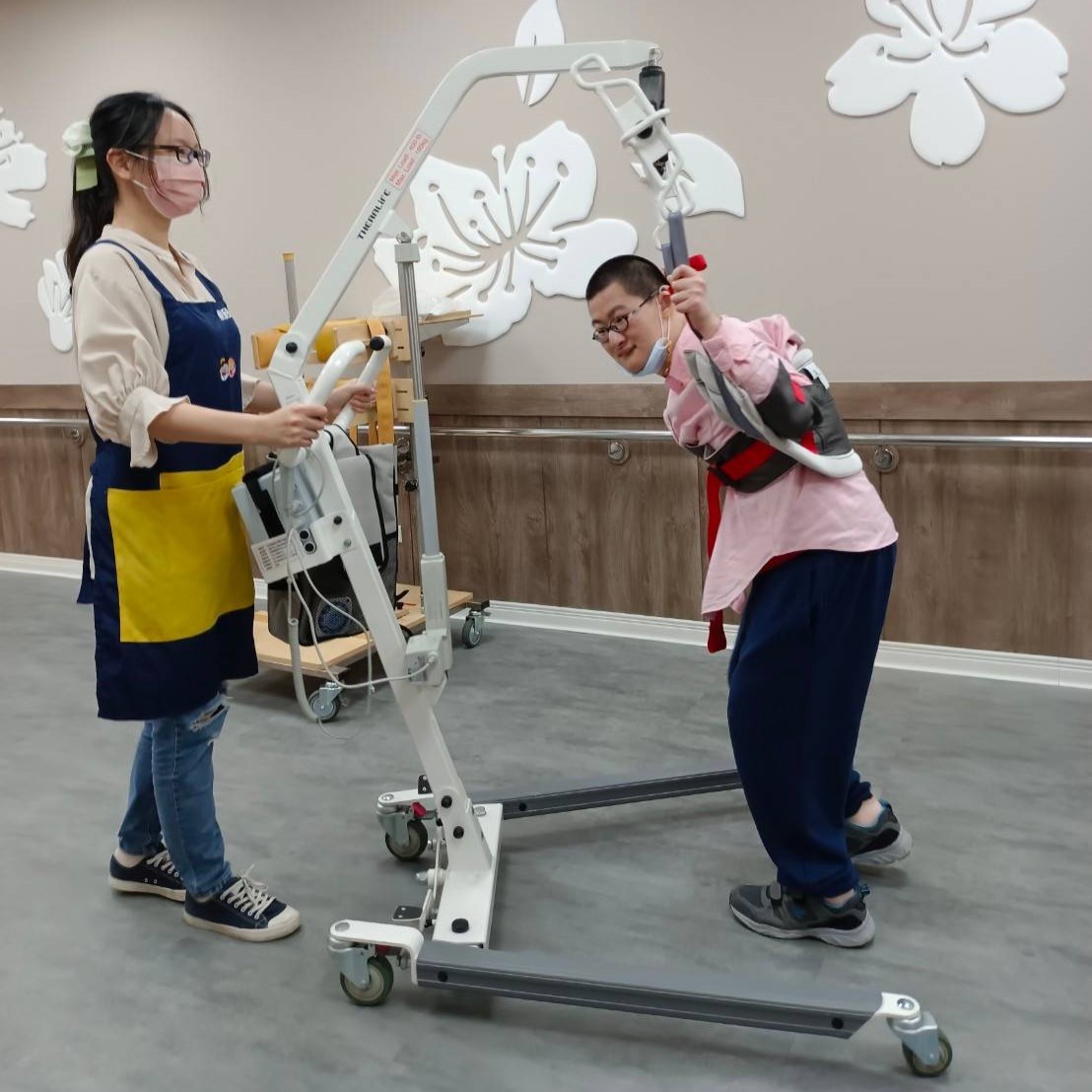 透過安全守護平台串聯多種設備資訊,智能調控每個區域的安全、臥床狀態、防跌偵測與緊急呼叫,也利用位移機、升降式洗臉台、沐浴椅等輔具進行零抬舉的照護,更用波浪式組合桌、可移動式起身扶手、旋轉洗澡椅等符合身障者需求的人因設計家具,結合生活訓練、社區活動、體能訓練等課程,協助強化自立生活能力,讓身心障礙者與照顧者都能更減壓舒適的面對長期照顧。