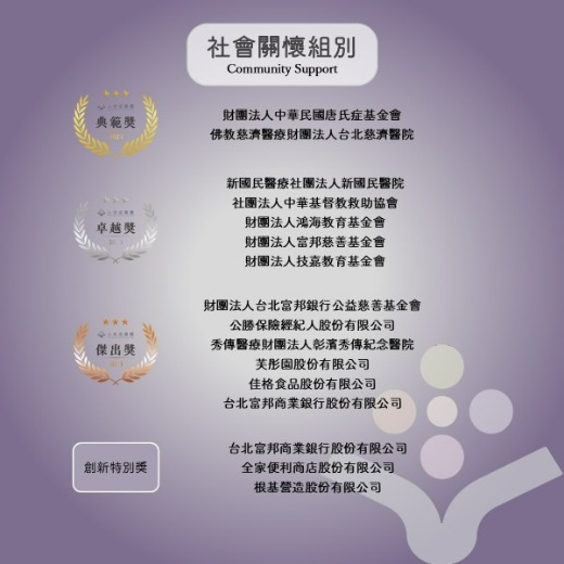 唐氏症基金會由於永續發展策略及實踐推展能量備受評審團肯定,足為各界師法學習,因此決定將社會金質獎(S)授予本會。