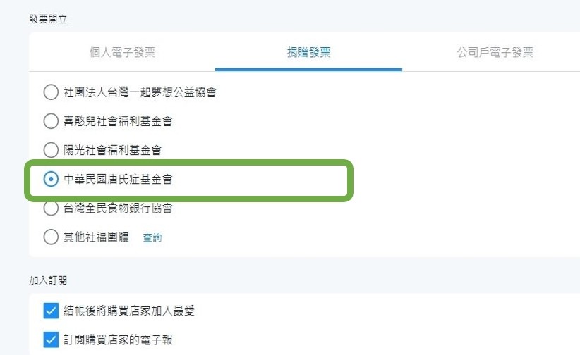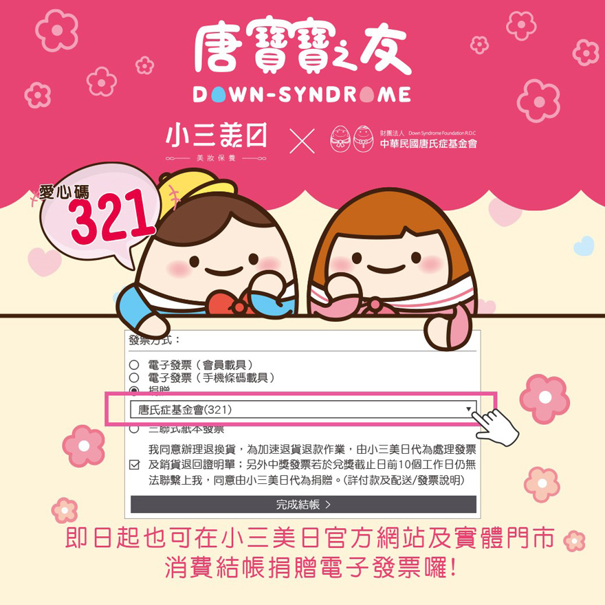 在操作結帳頁面時,點選捐贈電子發票,並輸入愛心碼【321】或搜尋【唐氏症基金會】即可完成。