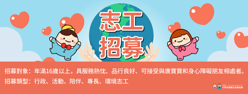 疫情逐漸趨緩,唐氏症基金會再次歡迎有服務熱忱,願意與我們唐寶寶、身心障礙青年及幼兒孩子們耐心相處的愛心人士,小小舉動都能成就善的循環,此刻就手動加入唐氏症基金會志工大家庭的一份子吧!