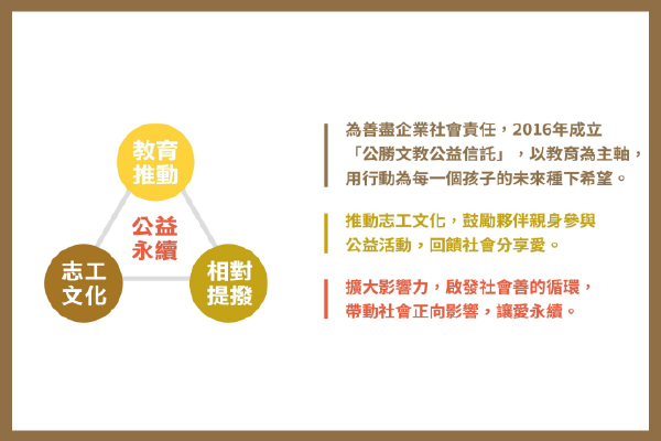 公勝推動「相對提撥」專案,旨在協助志工團在地經營、區域扎根,因此鼓勵各業務中心志工團依據各公益議題主動發掘具需求的單位,並進一步提出服務計畫。各志工團透過此過程發展出不同面向的服務領域,而志工夥伴對服務也相當程度的了解後,投入服務的意願也更強烈。