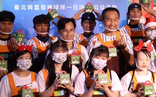 臺北興富發棒球隊長期關注社會公益議題!臺北市政府體育局李再立 局長帶領球員們今(16)日下午於唐氏症基金會愛不囉嗦承德店舉行「耶誕送暖,愛心紅不讓」一日店長公益活動,一起在耶誕前夕放下球棒,拿起擀麵棍與唐寶寶學習製作餅乾、包裝禮盒, 並帶領他們體驗樂樂棒球,親身力挺唐寶寶的耶誕禮盒。
