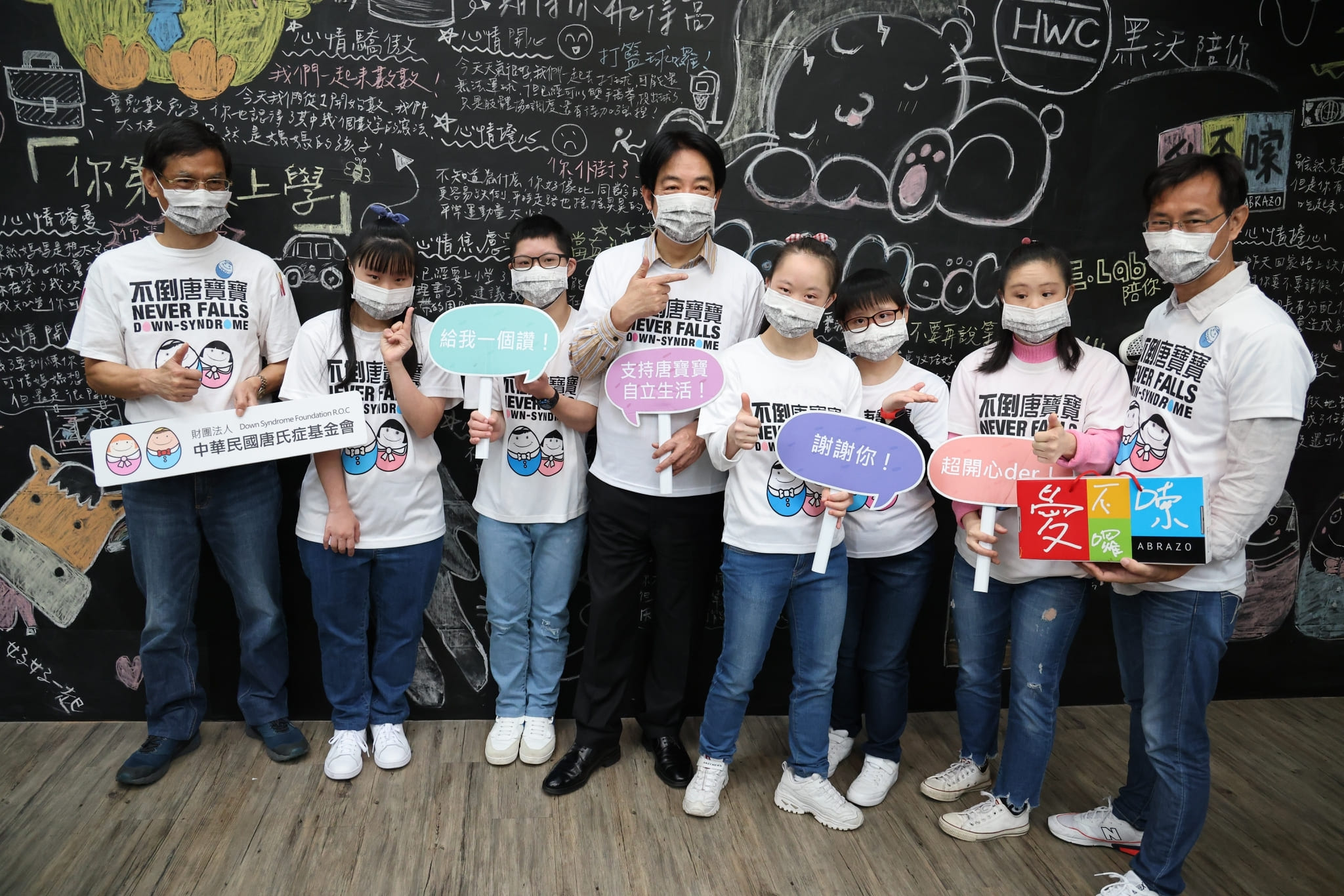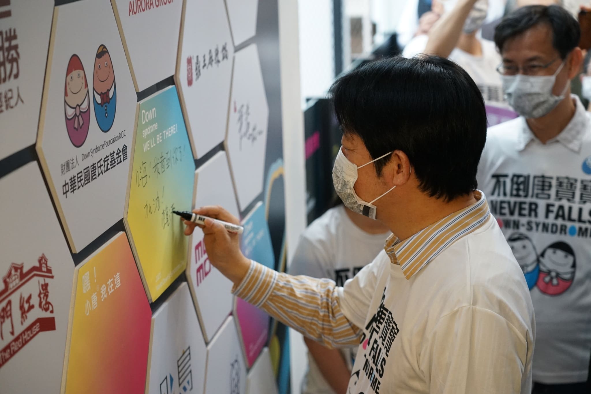 擔任副總統後,長時間投入社會公益的賴清德,21日前往「嘿!小唐我在這」大眾展,在「小小導覽員」唐寶寶的引領下,逐一認識各展區,也在打卡區與唐寶寶一起自拍,最後唐寶寶更送上賴清德的雷雕畫像,並在歡愉的氣氛下,齊聚合影為此次參訪留下深刻的回憶。賴清德分享,與唐寶寶相處能感受到他們熱情體貼的一面,像是逛展時總會興奮地一直補充自己的想法,還特別與老師討論設計出小禮物,呼籲大眾不要因為他們身材短小、輪廓扁平的特徵對他們產生誤解,下次遇到他們給一個微笑,對於他們都是莫大的鼓勵。對於本次展覽,賴清德指出,過往參加過的公益展,總會強調「愛」或「礙」,基金會本次運用社會創新的思維,以情境式的方式,把唐寶寶、心智障礙者成長過程搖身一變成為網美景點,透過拍照讓觀展者以有趣的方式體驗他們的成長歷程其實與自己沒有太大的不同,也邀請近百名身心障礙者共同創作10米長黑板,並讓民眾透過圖像、文字的方式一起對話,進而產生互動與認同,是非常大的突破。
