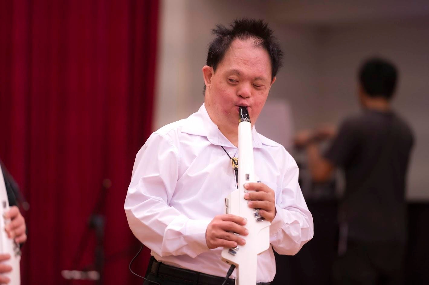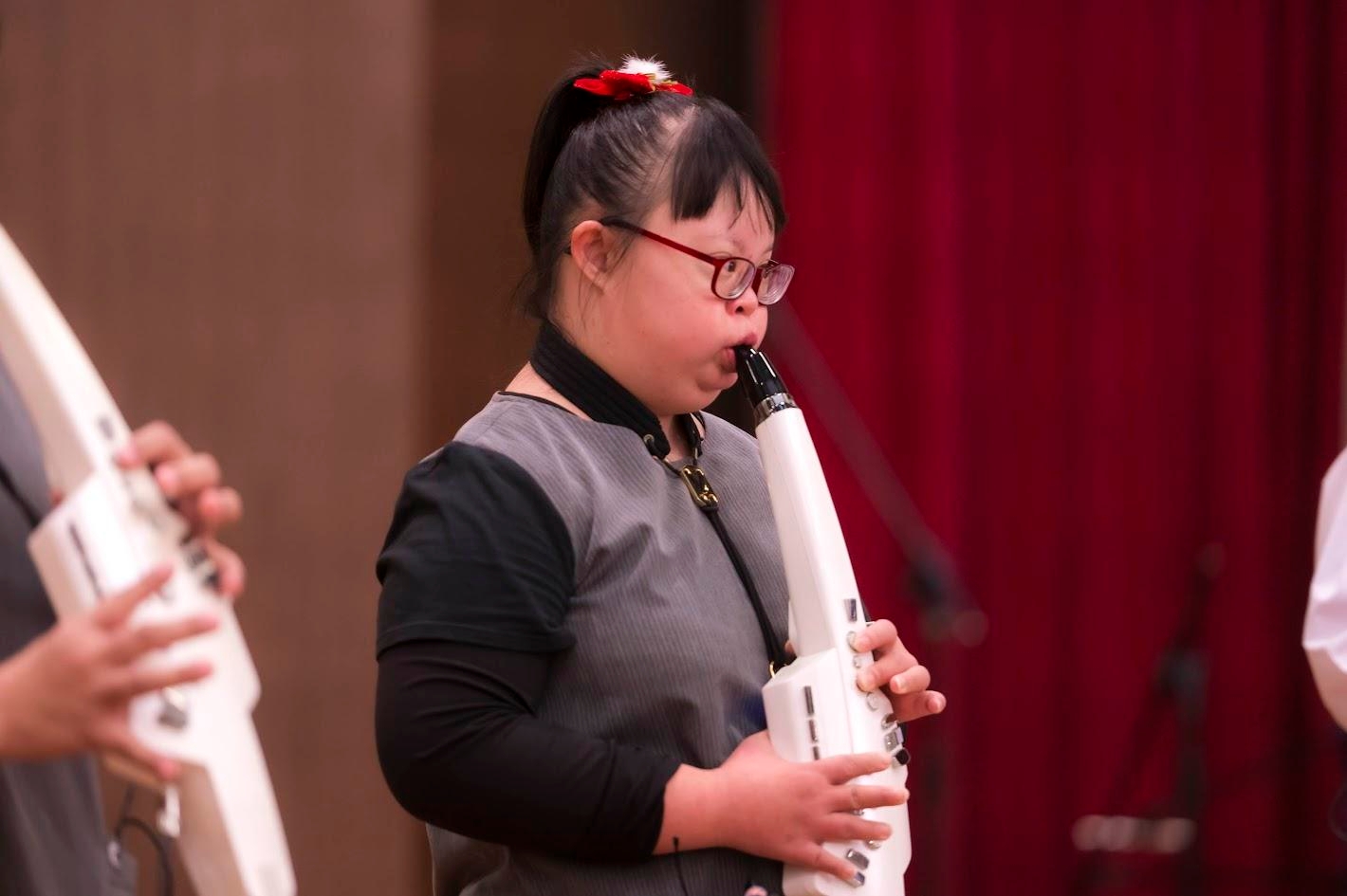 唐寶寶能站上舞台,表演一曲,著實不易,短短五分鐘,花費家長、工作人員大量心力。基金會開辦多元才藝班隊,除電子吹管,另有陶笛、舞蹈、太鼓等。經由才藝班隊訓練,孩子考取街頭藝人證照,獲得打賞,邁向自立,其帶給家長與孩子的鼓舞,難以言喻。不僅邁向自立,才藝班隊也能陶冶性情、培養嗜好,孩子情緒更穩定。