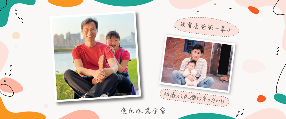 小時候,在那個資訊還不發達的年代,爸爸除了要忍受還沒接受治療與專業訓練而常常發脾氣耍任性的我,在外面還要承接各種的流言蜚語,哪怕有很多人對他說了不禮貌的話,就算心中受傷也不曾放棄。爸爸總是認真的講解唐氏症的原由,讓大家明白我們跟別人沒有什麼不一樣,只是需要多一點點的支持而已。現在的我已經長大了,我今年27歲,爸爸是我最好的靠山,我也是爸爸最好的依靠,我們約定好要四處遊玩、平安健康、一起變老…,我也許下心中的願望:「爸爸~我會養你一輩子」。